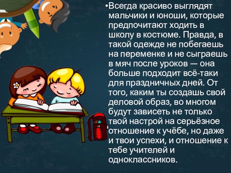 в костюме. Правда, в такой одежде не побегаешь на переменке и не сыграешь в мяч после уроков — она больше подходит всё-таки для праздничных дней. От того, каким ты создашь свой деловой образ, во многом будут зависеть не только твой настрой на серьёзное отношение к учёбе, но даже и твои успехи, и отношение к тебе учителей и одноклассников.