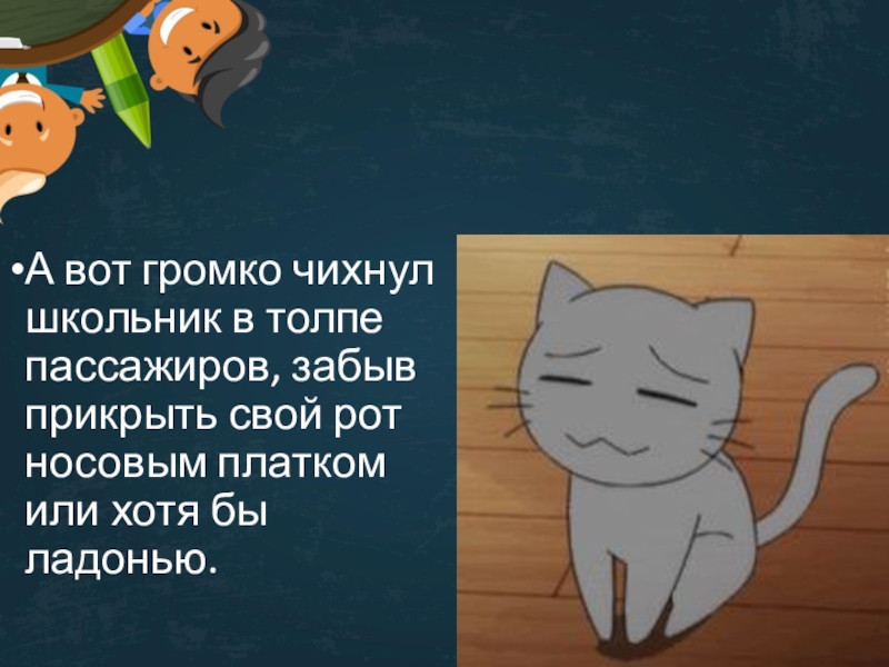 Слайд 14А вот громко чихнул школьник в толпе пассажиров, забыв прикрыть свой