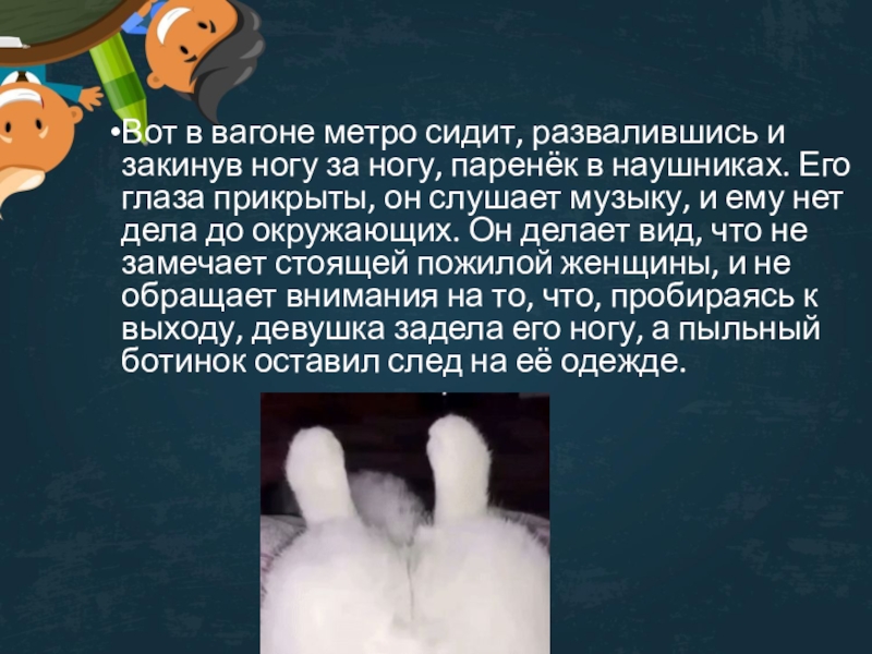 паренёк в наушниках. Его глаза прикрыты, он слушает музыку, и ему нет дела до окружающих. Он делает вид, что не замечает стоящей пожилой женщины, и не обращает внимания на то, что, пробираясь к выходу, девушка задела его ногу, а пыльный ботинок оставил след на её одежде.