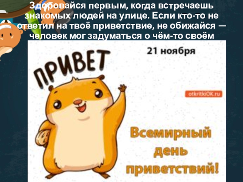 Слайд 19Здоровайся первым, когда встречаешь знакомых людей на улице. Если кто-то не