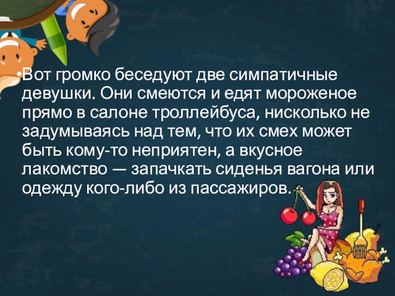 прямо в салоне троллейбуса, нисколько не задумываясь над тем, что их смех может быть кому-то неприятен, а вкусное лакомство — запачкать сиденья вагона или одежду кого-либо из пассажиров.