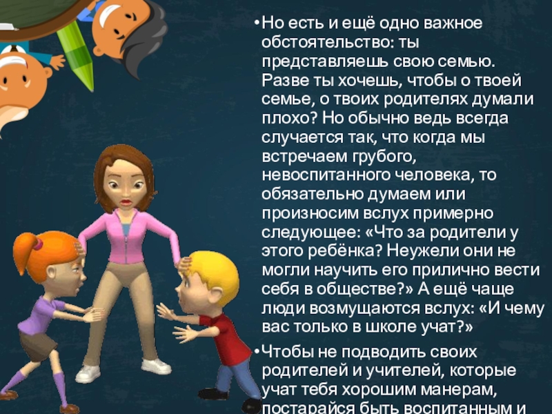 Разве ты хочешь, чтобы о твоей семье, о твоих родителях думали плохо? Но обычно ведь всегда случается так, что когда мы встречаем грубого, невоспитанного человека, то обязательно думаем или произносим вслух примерно следующее: «Что за родители у этого ребёнка? Неужели они не могли научить его прилично вести себя в обществе?» А ещё чаще люди возмущаются вслух: «И чему вас только в школе учат?»