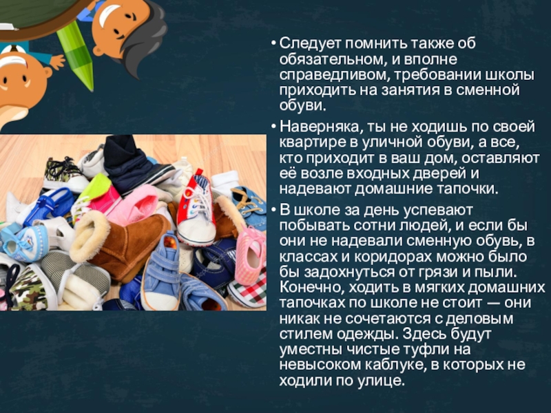 В школе за день успевают побывать сотни людей, и если бы они не надевали сменную обувь, в классах и коридорах можно было бы задохнуться от грязи и пыли. Конечно, ходить в мягких домашних тапочках по школе не стоит — они никак не сочетаются с деловым стилем одежды. Здесь будут уместны чистые туфли на невысоком каблуке, в которых не ходили по улице.