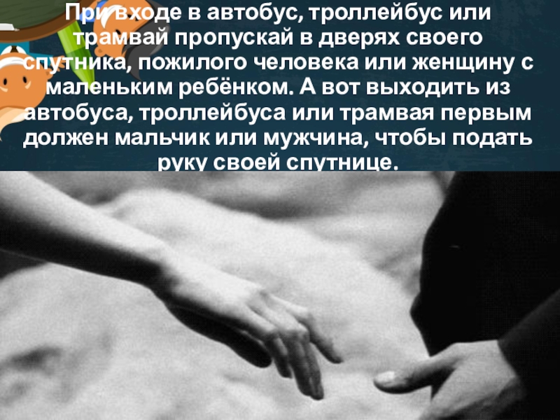 спутника, пожилого человека или женщину с маленьким ребёнком. А вот выходить из автобуса, троллейбуса или трамвая первым должен мальчик или мужчина, чтобы подать руку своей спутнице.