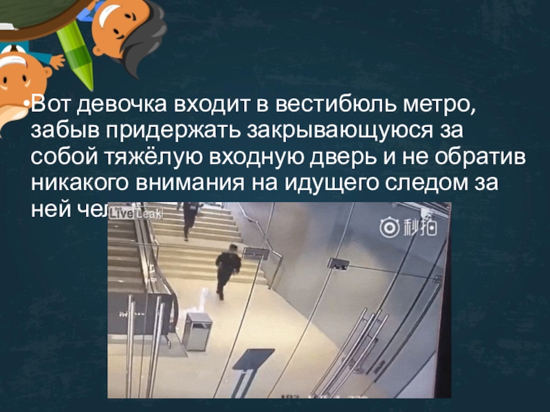 Слайд 15Вот девочка входит в вестибюль метро, забыв придержать закрывающуюся за собой