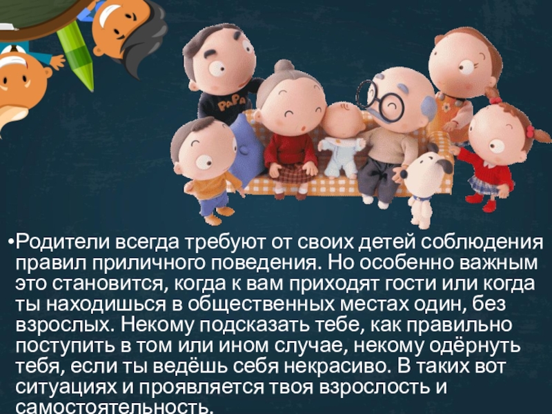 Слайд 6Родители всегда требуют от своих детей соблюдения правил приличного поведения. Но