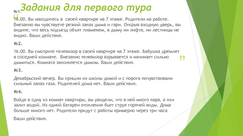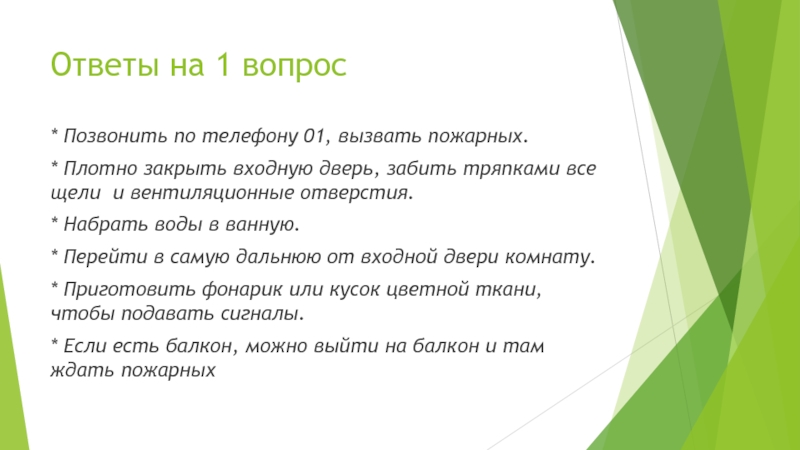 этаже. Родители на работе. Внезапно вы чувствуете резкий запах дыма и гари. Открыв входную дверь, вы видите, что весь подъезд объят пламенем, в дыму ни лифта, ни лестницы не видно. Ваши действия.