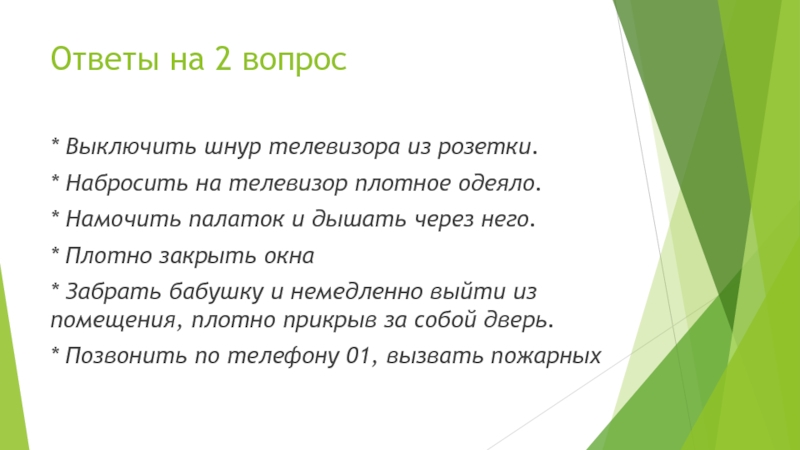 16.00. Вы смотрите телевизор в своей квартире на 7 этаже. Бабушка дремлет в соседней комнате. Внезапно телевизор взрывается и начинает сильно дымиться. Комната заполняется дымом. Ваши действия.