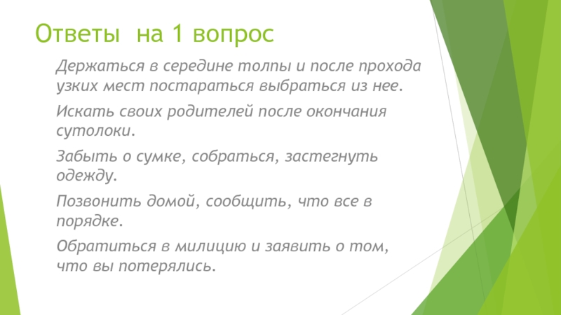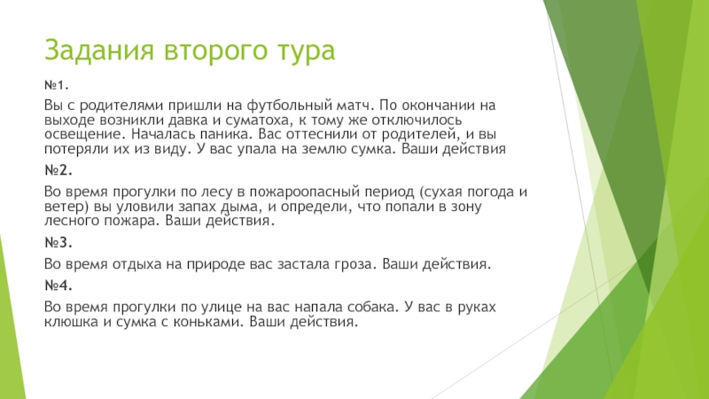 на выходе возникли давка и суматоха, к тому же отключилось освещение. Началась паника. Вас оттеснили от родителей, и вы потеряли их из виду. У вас упала на землю сумка. Ваши действия