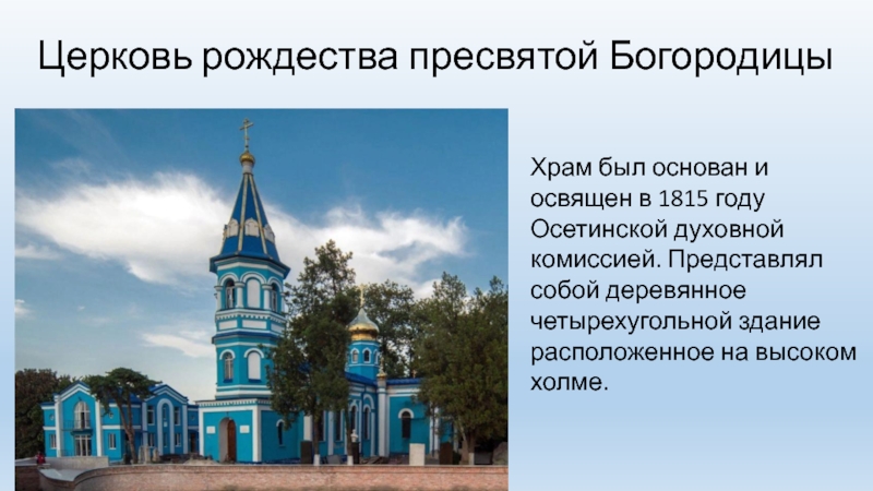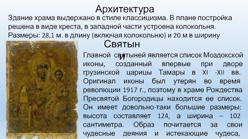 Главной святыней является список Моздокской иконы, созданный впервые при дворе грузинской царицы Тамары в XI -XII вв. Оригинал иконы был утерян во время революции 1917 г., поэтому в храме Рождества Пресвятой Богородицы находится ее список. Он имеет довольно-таки большие размеры: высота составляет 124, а ширина – 102 сантиметра. Образ почитается за свои чудесные деяния и истекающие чудеса, которые приписывают Богородице.