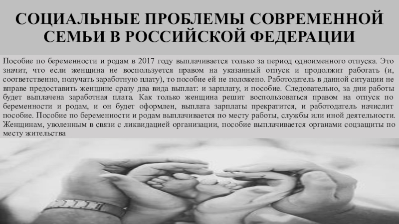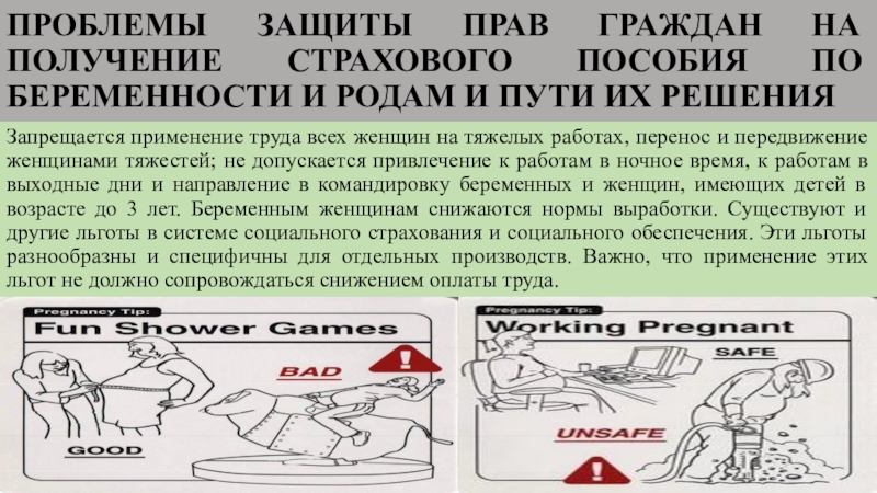 Запрещается применение труда всех женщин на тяжелых работах, перенос и передвижение женщинами тяжестей; не допускается привлечение к работам в ночное время, к работам в выходные дни и направление в командировку беременных и женщин, имеющих детей в возрасте до 3 лет. Беременным женщинам снижаются нормы выработки. Существуют и другие льготы в системе социального страхования и социального обеспечения. Эти льготы разнообразны и специфичны для отдельных производств. Важно, что применение этих льгот не должно сопровождаться снижением оплаты труда.