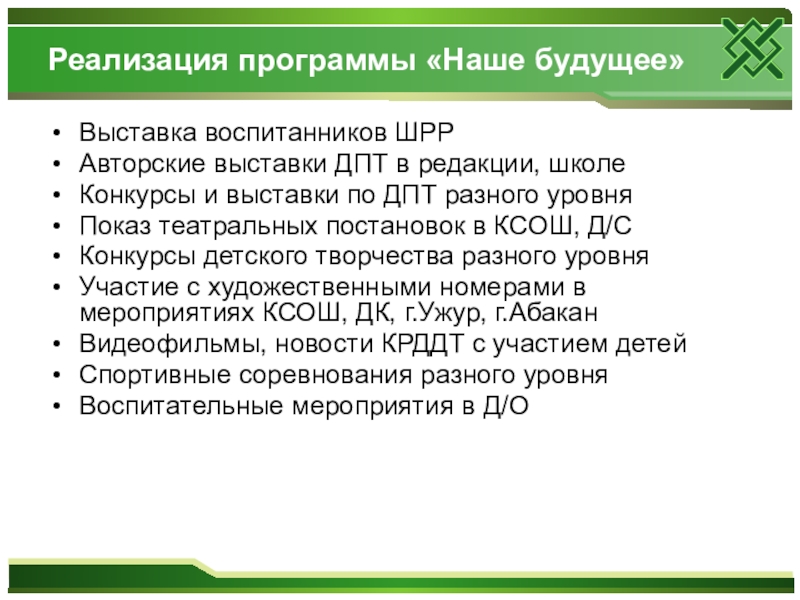 Это сайт презентаций, где можно хранить и обмениваться своими презентациями, докладами, проектами, шаблонами в формате PowerPoint с другими пользователями. Мы помогаем школьникам, студентам, учителям, преподавателям хранить и обмениваться учебными материалами.