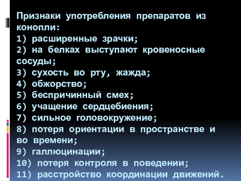 Слайд 6Признаки употребления препаратов из конопли: