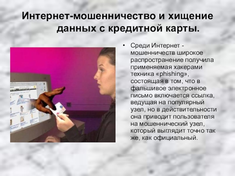Слайд 7Интернет-мошенничество и хищение данных с кредитной карты.