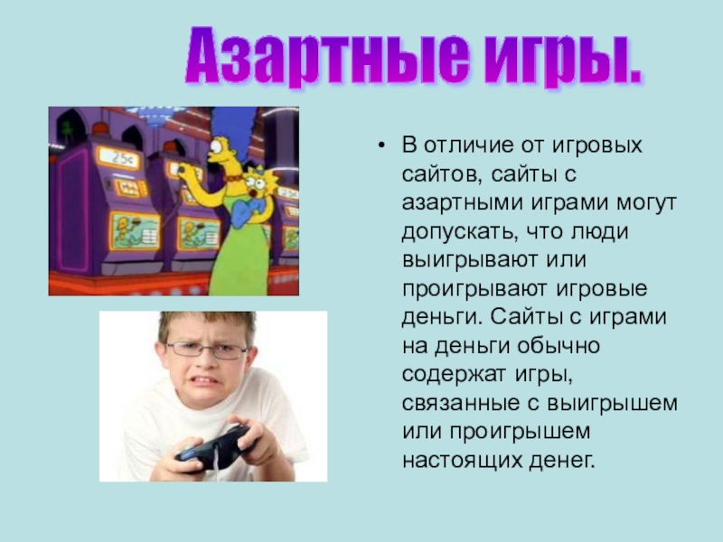 Слайд 8В отличие от игровых сайтов, сайты с азартными играми могут допускать,