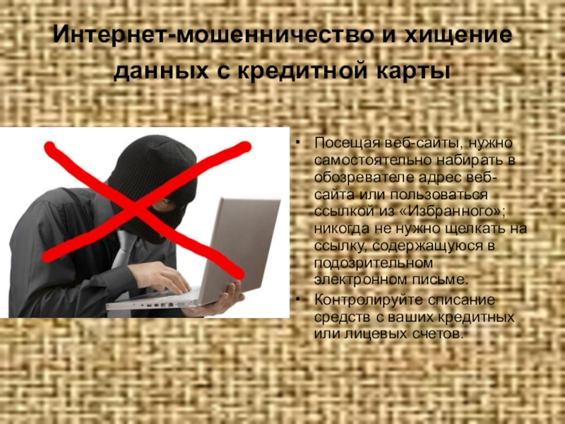 Слайд 18Интернет-мошенничество и хищение данных с кредитной карты