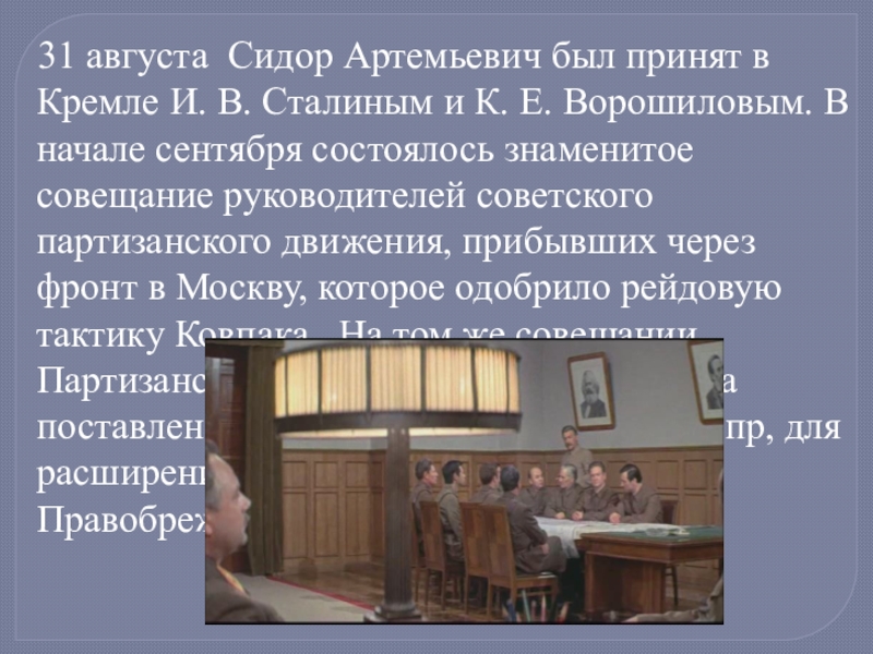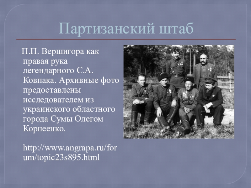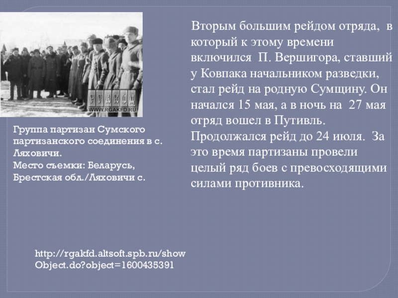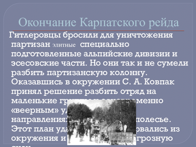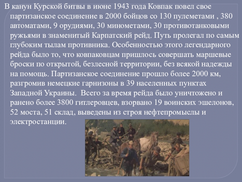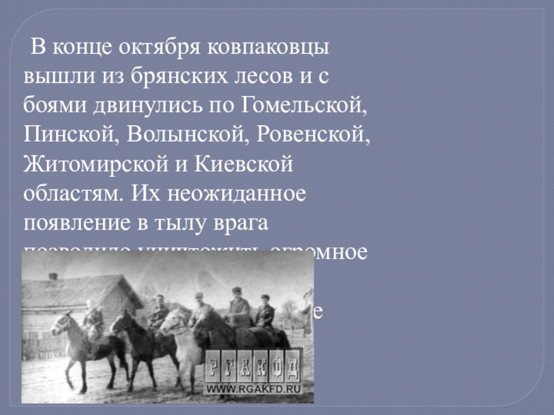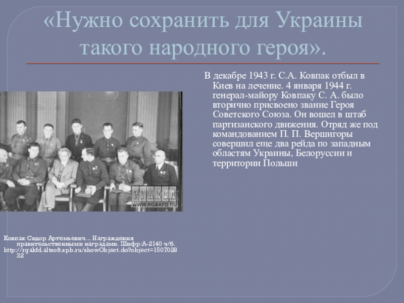 В декабре 1943 г. С.А. Ковпак отбыл в Киев на лечение. 4 января 1944 г. генерал-майору Ковпаку С. А. было вторично присвоено звание Героя Советского Союза. Он вошел в штаб партизанского движения. Отряд же под командованием П. П. Вершигоры совершил еще два рейда по западным областям Украины, Белоруссии и территории Польши