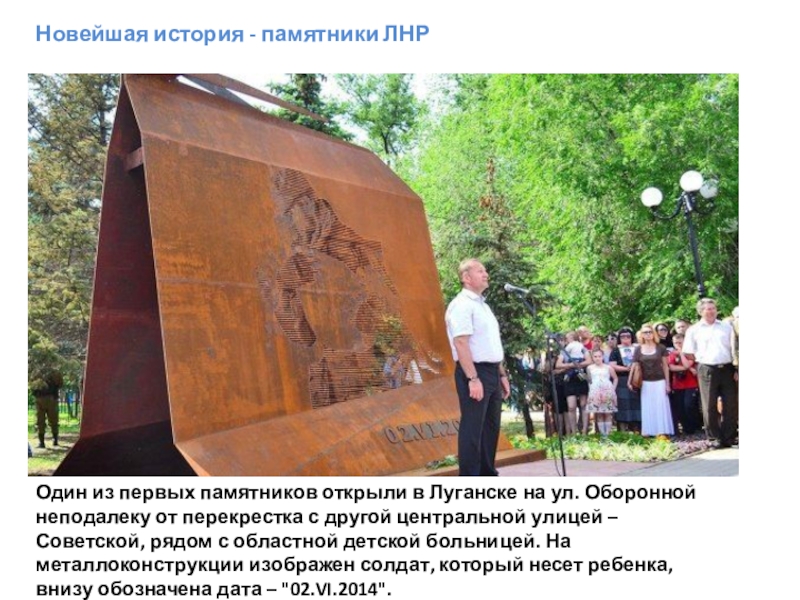 на ул. Оборонной неподалеку от перекрестка с другой центральной улицей – Советской, рядом с областной детской больницей. На металлоконструкции изображен солдат, который несет ребенка, внизу обозначена дата – "02.VI.2014".
