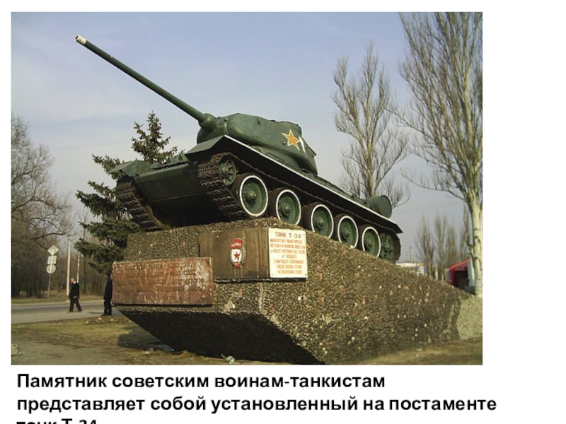 Слайд 11Памятник советским воинам-танкистам представляет собой установленный на постаменте танк Т-34