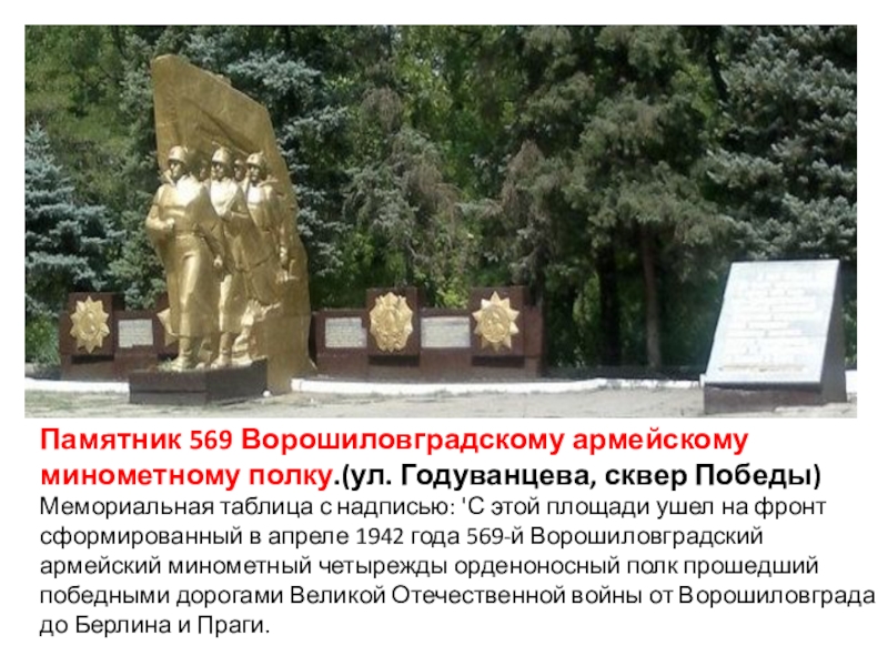 Слайд 26Памятник 569 Ворошиловградскому армейскому минометному полку.(ул. Годуванцева, сквер Победы)