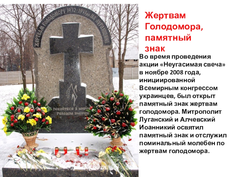 2008 года, инициированной Всемирным конгрессом украинцев, был открыт памятный знак жертвам голодомора. Митрополит Луганский и Алчевский Иоанникий освятил памятный знак и отслужил поминальный молебен по жертвам голодомора.