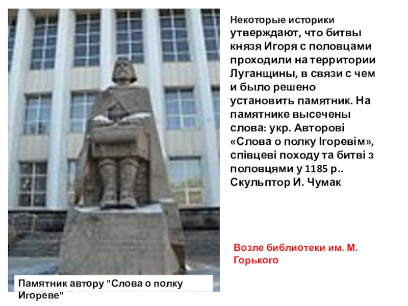 территории Луганщины, в связи с чем и было решено установить памятник. На памятнике высечены слова: укр. Авторові «Слова о полку Ігоревім», співцеві походу та битві з половцями у 1185 р.. Скульптор И. Чумак