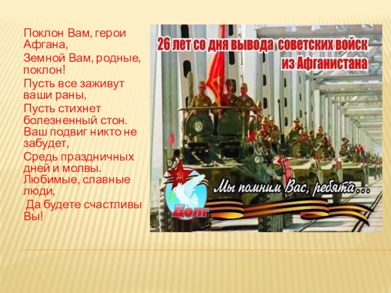Слайд 15Поклон Вам, герои Афгана,