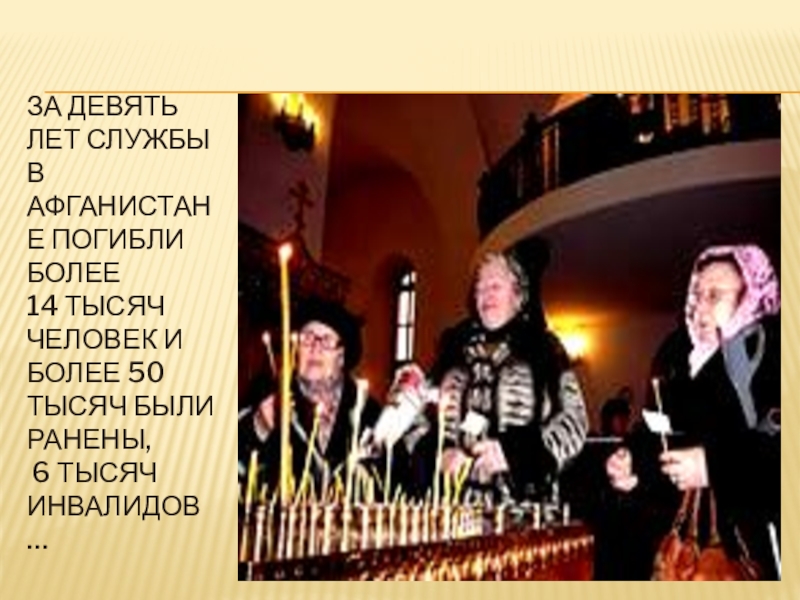 Слайд 8За девять лет службы в Афганистане погибли более 14 тысяч человек и