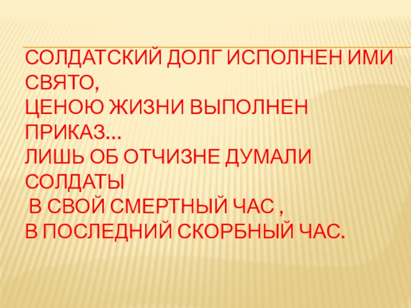 Слайд 13Солдатский долг исполнен ими свято, Ценою жизни выполнен приказ… Лишь об Отчизне думали