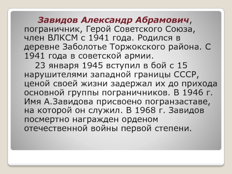 Слайд 20 Завидов Александр Абрамович, пограничник, Герой Советского Союза,