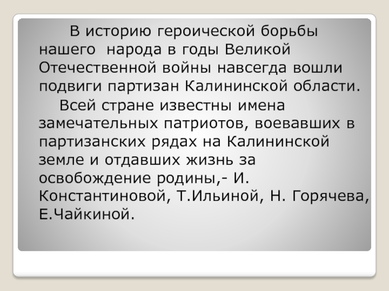 Всей стране известны имена замечательных патриотов, воевавших в партизанских рядах на Калининской земле и отдавших жизнь за освобождение родины,- И.Константиновой, Т.Ильиной, Н. Горячева, Е.Чайкиной.