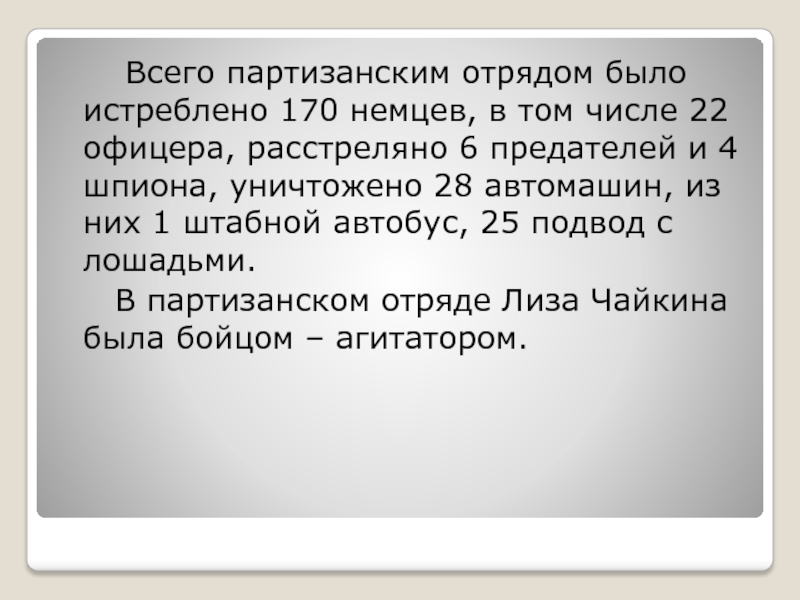 Слайд 14 Всего партизанским отрядом было истреблено 170 немцев, в