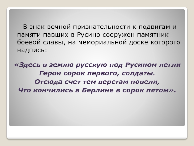 павших в Русино сооружен памятник боевой славы, на мемориальной доске которого надпись: