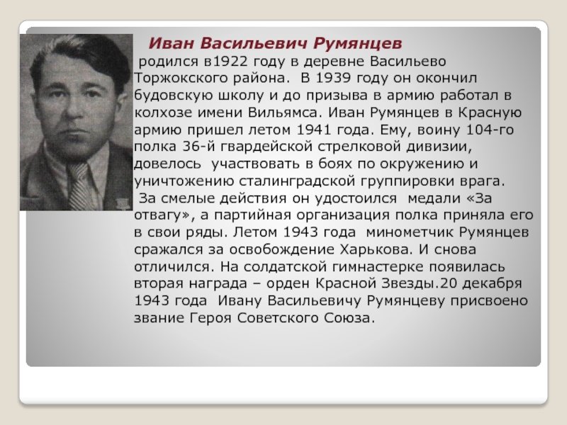 Торжокского района. В 1939 году он окончил будовскую школу и до призыва в армию работал в колхозе имени Вильямса. Иван Румянцев в Красную армию пришел летом 1941 года. Ему, воину 104-го полка 36-й гвардейской стрелковой дивизии, довелось участвовать в боях по окружению и уничтожению сталинградской группировки врага.