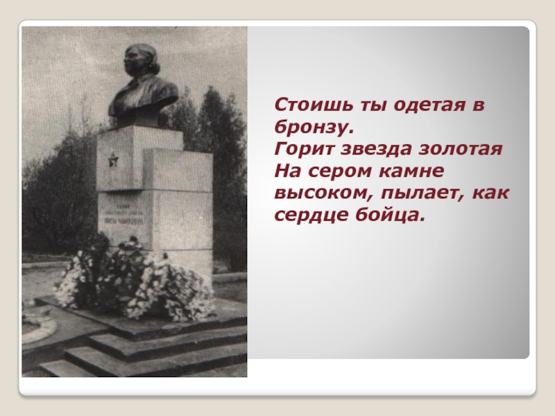 Слайд 12Стоишь ты одетая в бронзу.