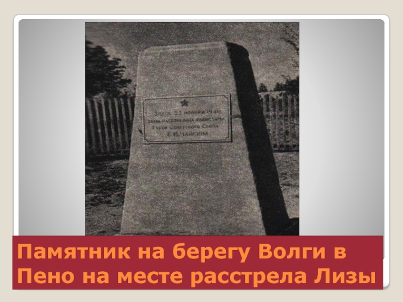 Слайд 8Памятник на берегу Волги в Пено на месте расстрела Лизы