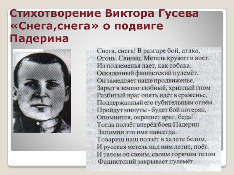 Слайд 17Стихотворение Виктора Гусева «Снега,снега» о подвиге Падерина