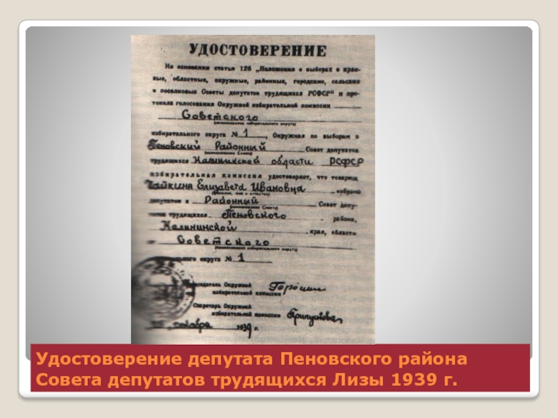 Слайд 6Удостоверение депутата Пеновского района Совета депутатов трудящихся Лизы 1939 г.