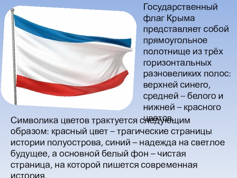 Символика цветов трактуется следующим образом: красный цвет – трагические страницы истории полуострова, синий – надежда на светлое будущее, а основной белый фон – чистая страница, на которой пишется современная история.