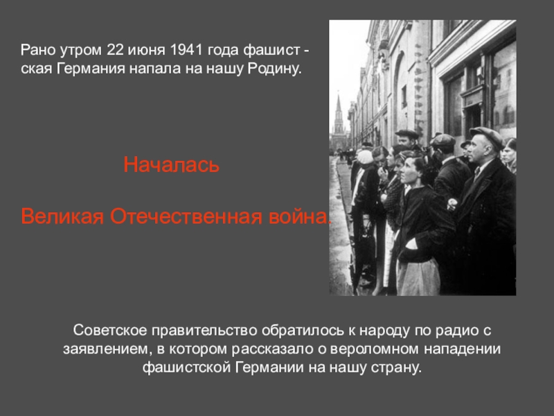 Рано утром 22 июня 1941 года фашист -ская Германия напала на нашу Родину.