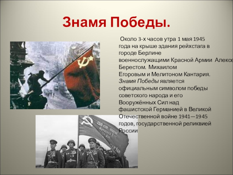 городе Берлине военнослужащими Красной Армии Алексеем Берестом. Михаилом Егоровым и Мелитоном Кантария. Знамя Победы является официальным символом победы советского народа и его Вооружённых Сил над фашистской Германией в Великой Отечественной войне 1941—1945 годов, государственной реликвией России