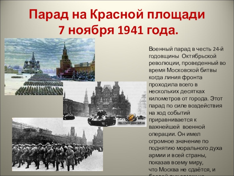 Октябрьской революции, проведенный во время Московской битвы когда линия фронта проходила всего в нескольких десятках километров от города. Этот парад по силе воздействия на ход событий приравнивается к важнейшей военной операции. Он имел огромное значение по поднятию морального духа армии и всей страны, показав всему миру, что Москва не сдаётся, и боевой дух армии не сломлен.[