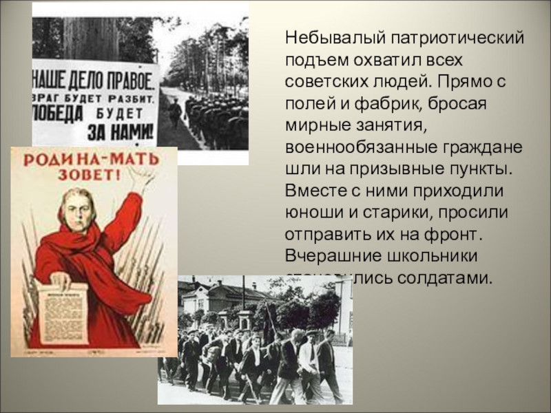 Слайд 4Небывалый патриотический подъем охватил всех советских людей. Прямо с полей и