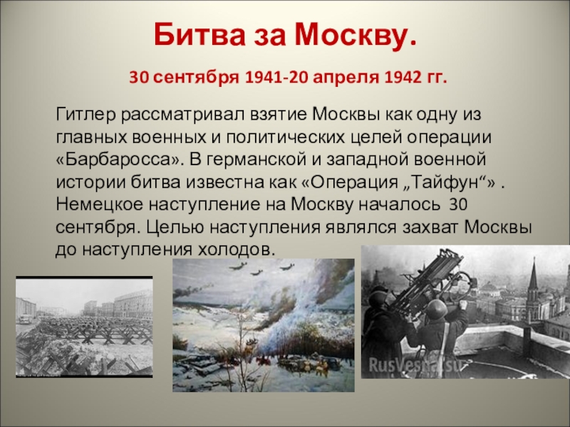 Гитлер рассматривал взятие Москвы как одну из главных военных и политических целей операции «Барбаросса». В германской и западной военной истории битва известна как «Операция „Тайфун“» .Немецкое наступление на Москву началось 30 сентября. Целью наступления являлся захват Москвы до наступления холодов.