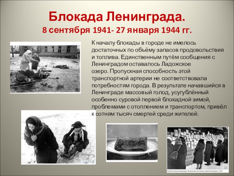городе не имелось достаточных по объёму запасов продовольствия и топлива. Единственным путём сообщения с Ленинградом оставалось Ладожское озеро. Пропускная способность этой транспортной артерии не соответствовала потребностям города. В результате начавшийся в Ленинграде массовый голод, усугублённый особенно суровой первой блокадной зимой, проблемами с отоплением и транспортом, привёл к сотням тысяч смертей среди жителей.