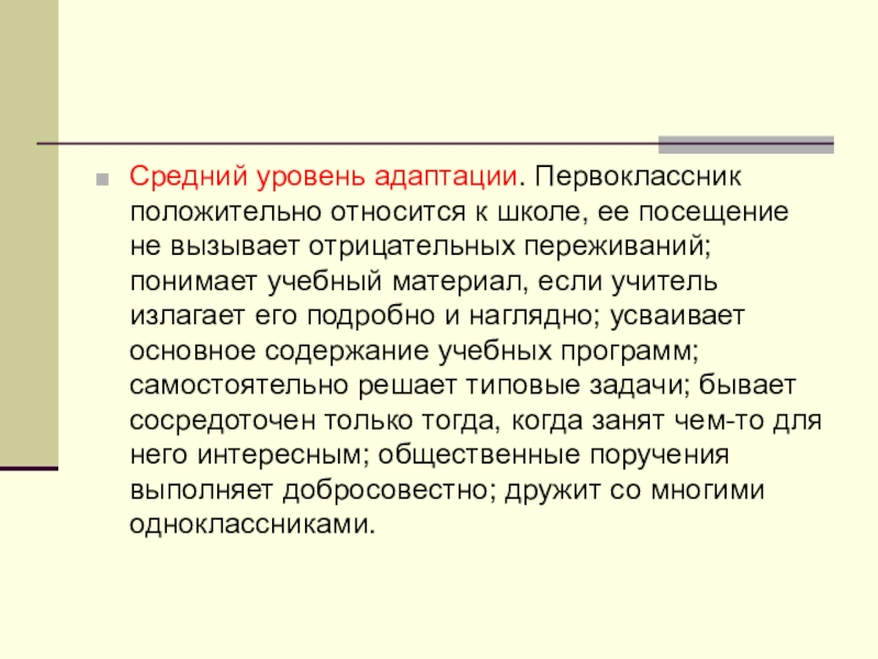 Средний уровень адаптации. Первоклассник положительно относится к школе, ее посещение не
