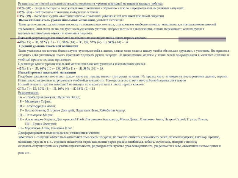 Результаты по данной методике позволяют определить уровень школьной мотивации каждого ребенка: