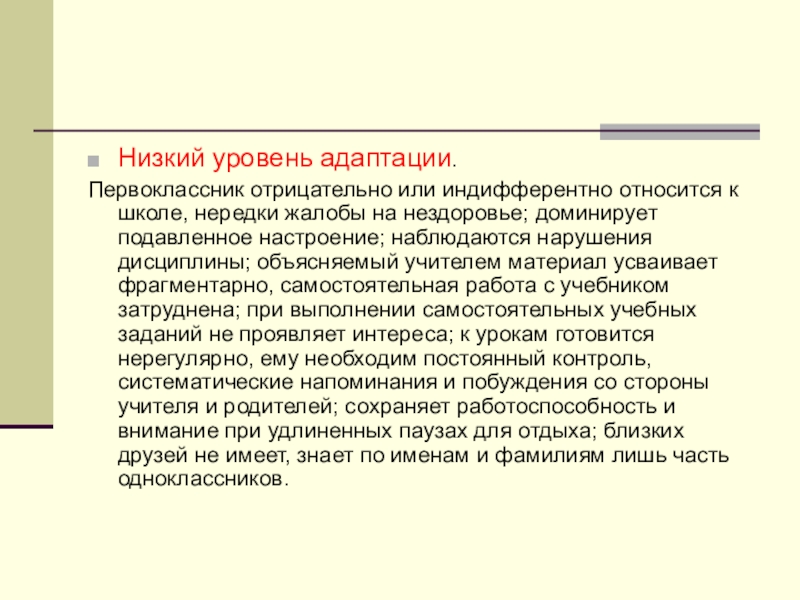жалобы на нездоровье; доминирует подавленное настроение; наблюдаются нарушения дисциплины; объясняемый учителем материал усваивает фрагментарно, самостоятельная работа с учебником затруднена; при выполнении самостоятельных учебных заданий не проявляет интереса; к урокам готовится нерегулярно, ему необходим постоянный контроль, систематические напоминания и побуждения со стороны учителя и родителей; сохраняет работоспособность и внимание при удлиненных паузах для отдыха; близких друзей не имеет, знает по именам и фамилиям лишь часть одноклассников.