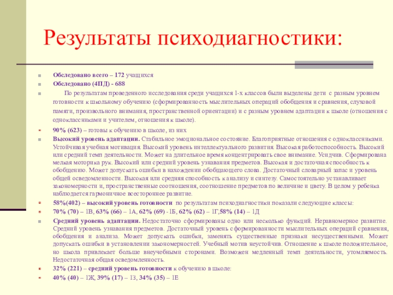 По результатам проведенного исследования среди учащихся 1-х классов были выделены дети с разным уровнем готовности к школьному обучению (сформированность мыслительных операций обобщения и сравнения, слуховой памяти, произвольного внимания, пространственной ориентации) и с разным уровнем адаптации к школе (отношения с одноклассниками и учителем, отношения к школе).