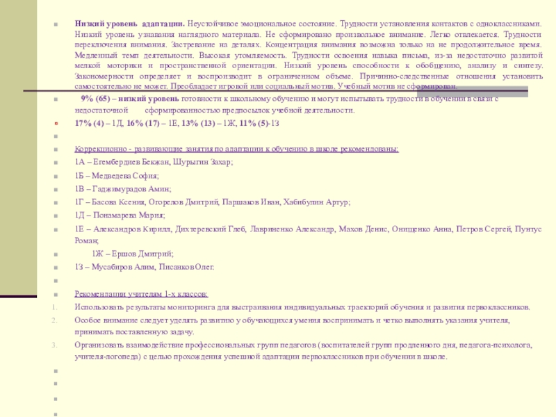 Низкий уровень адаптации. Неустойчивое эмоциональное состояние. Трудности установления контактов с одноклассниками.